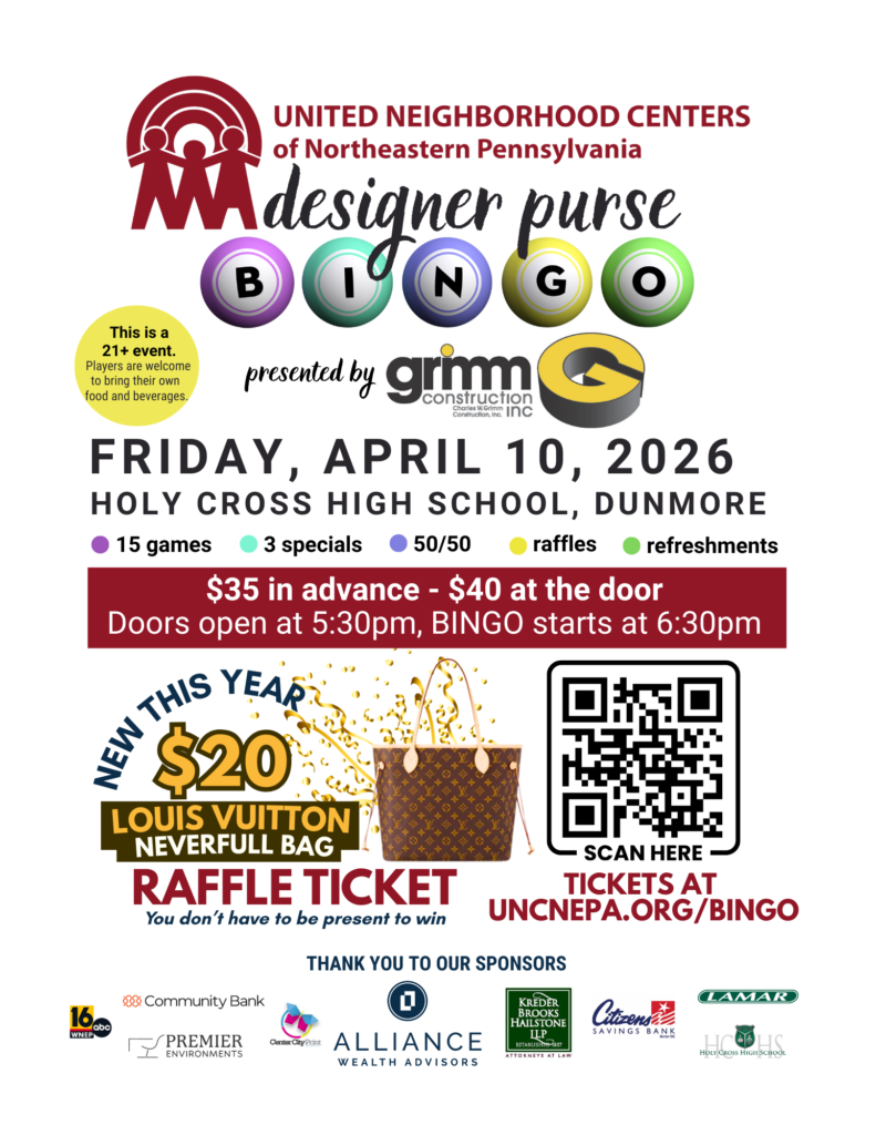 Join United Neighborhood Centers of Northeastern Pennsylvania (UNC) for our 4th Annual Designer Purse Bingo on Friday, April 10, 2026, at Holy Cross High School, 501 East Drinker Street, Dunmore.