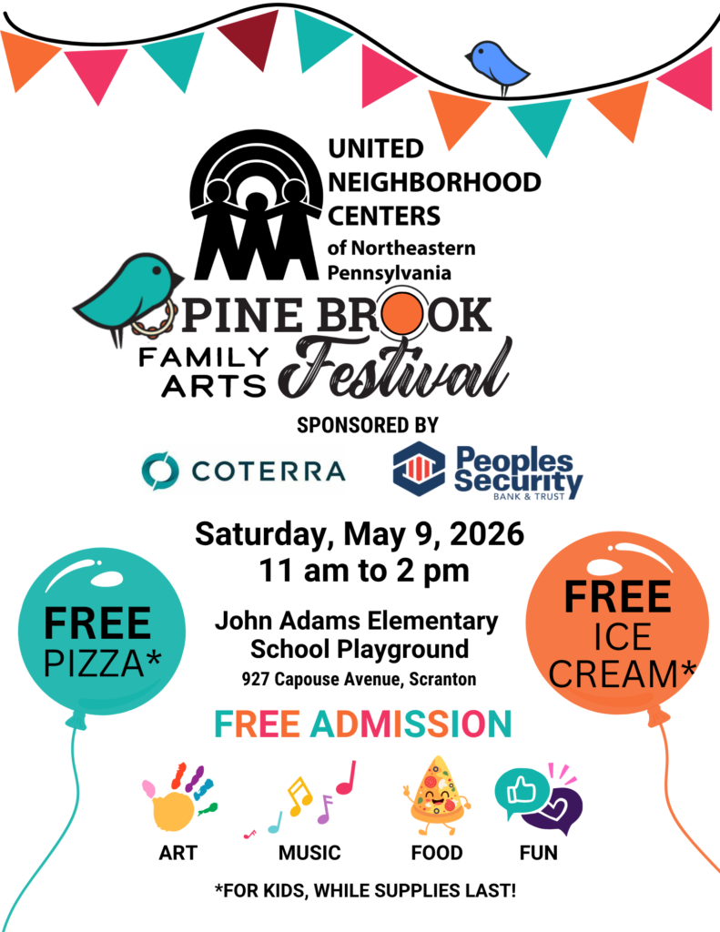 United Neighborhood Centers of Northeastern Pennsylvania’s Pine Brook Neighborhood Plan invites community members of all ages to attend the Pine Brook Family Arts Festival on Saturday, May 9, from 11 a.m. to 2 p.m. at John Adams Elementary School in Scranton.